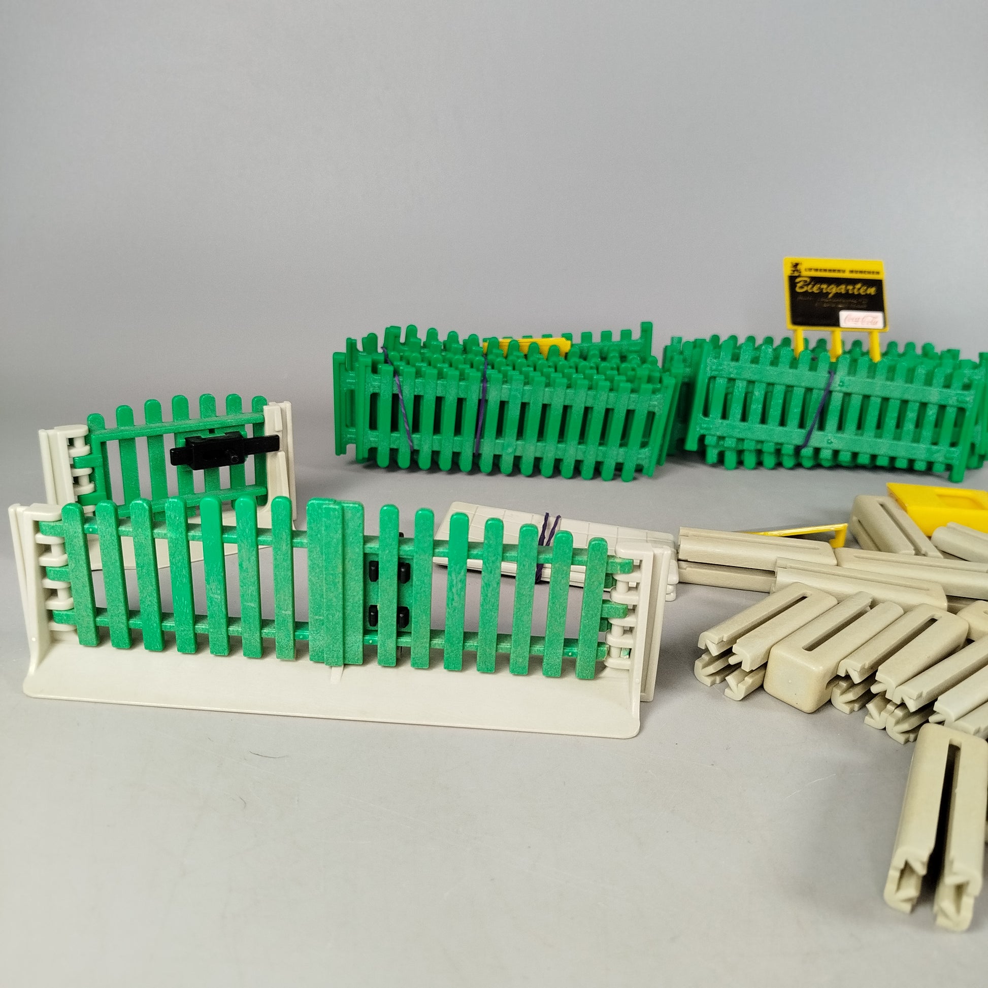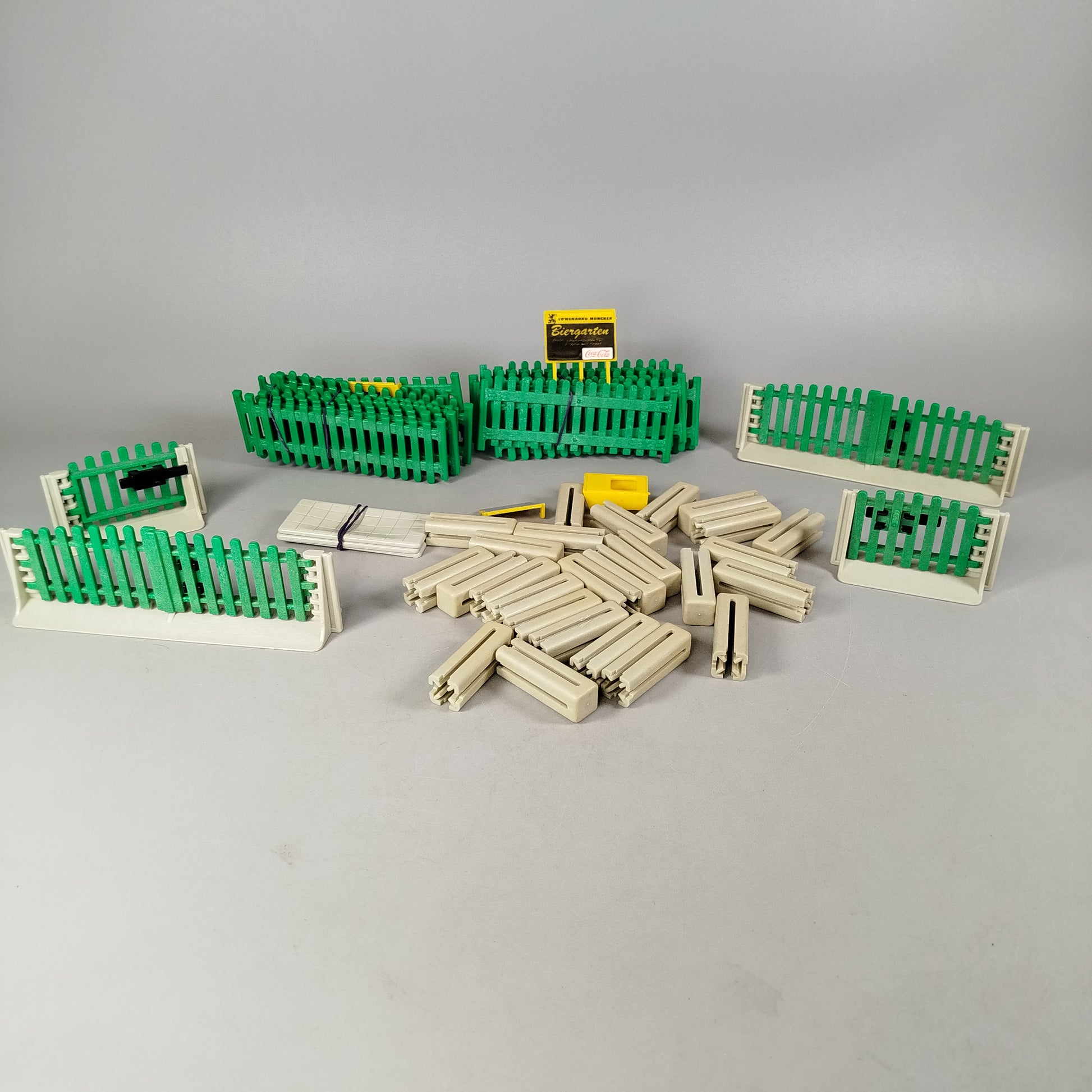 Hol dir das modulare Spielzeugzaun-System mit Biergarten-Thema der Marke Playmobil. Das Zaunset bestehend aus vier großen Zaunelementen auf weißen Standfüßen, davon zwei mit schwarzen Torverschlüssen, zwei größeren Bündeln grüner Zaunelemente, etwa 27 cremeweißen Verbindungspfosten, einem gelben Eckteil, mehreren weißen, gitterförmigen Bodenplatten sowie einem gelben Schild mit schwarzem Rahmen und der Aufschrift „JOHANNES WEIGLEIN – NÜRNBERG“ und „Biergarten“ inklusive kleinem Aufkleber „6/60“. Figuren sind nicht enthalten und ob alle ursprünglich zugehörigen Teile vorhanden sind, lässt sich nicht sicher sagen. Eine Originalverpackung ist nicht ersichtlich. Als Second-Hand-Spielzeug schenkt dieser Artikel Materialien ein zweites Leben. Aufgrund der enthaltenen Kleinteile ist das Spielzeug für Kinder ab etwa 3 Jahren geeignet und nicht für Kinder unter 3 Jahren empfohlen, da Erstickungsgefahr besteht.