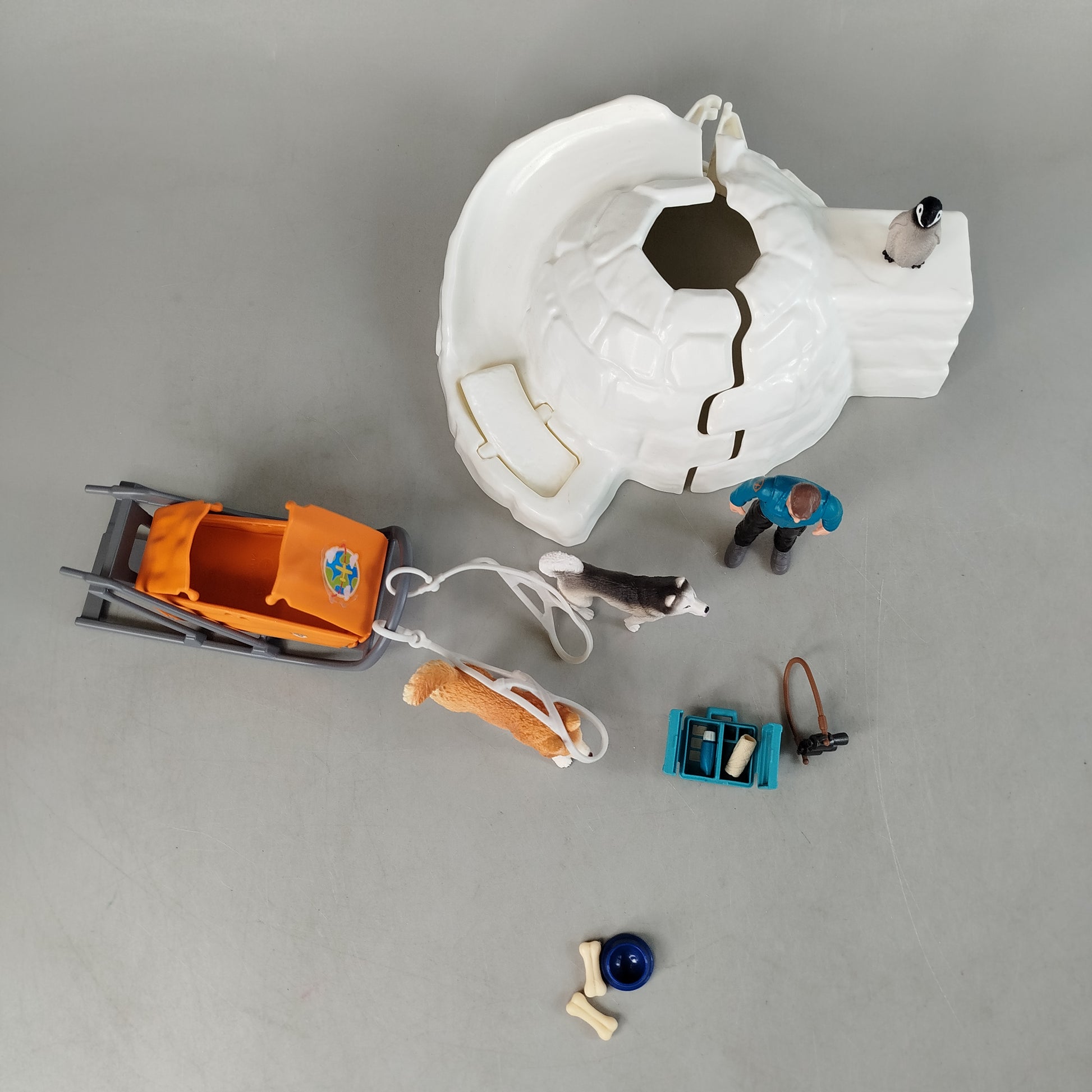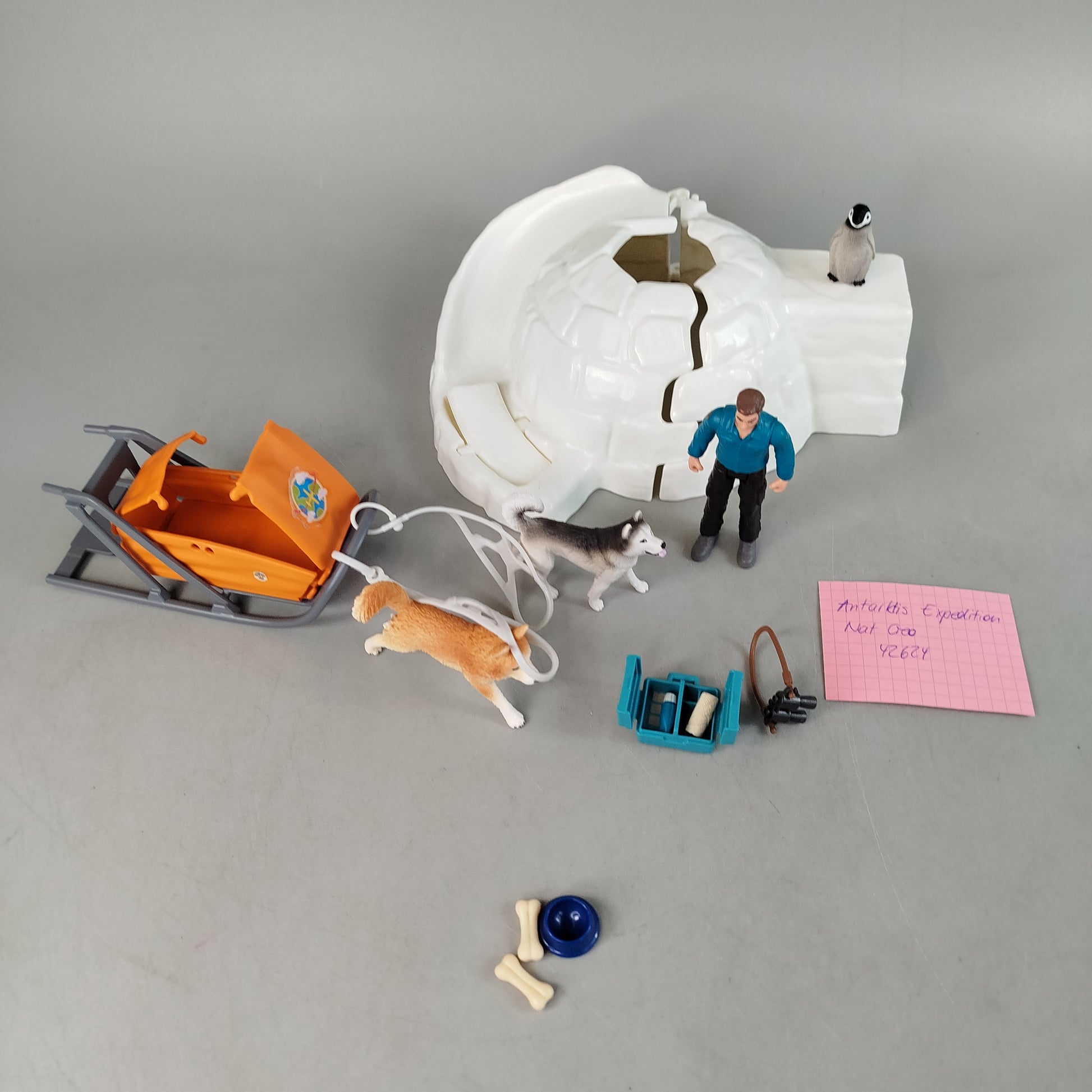 Das Schleich Wild Life Antarktis Expedition Set 42624 enthält eine menschliche Figur, zwei Hundefiguren und eine Pinguinfigur. Zum Set gehören außerdem ein Iglu mit abnehmbarem Dach, ein Hundeschlitten mit Geschirr, eine Aufbewahrungsbox, ein Fernglas, ein Napf und Knochen. Das Spielset regt zu Rollenspielen und fördert Kreativität und Motorik. Altersempfehlung: 6–9 Jahre. Achtung: Nicht für Kinder unter 3 Jahren geeignet, Erstickungsgefahr.