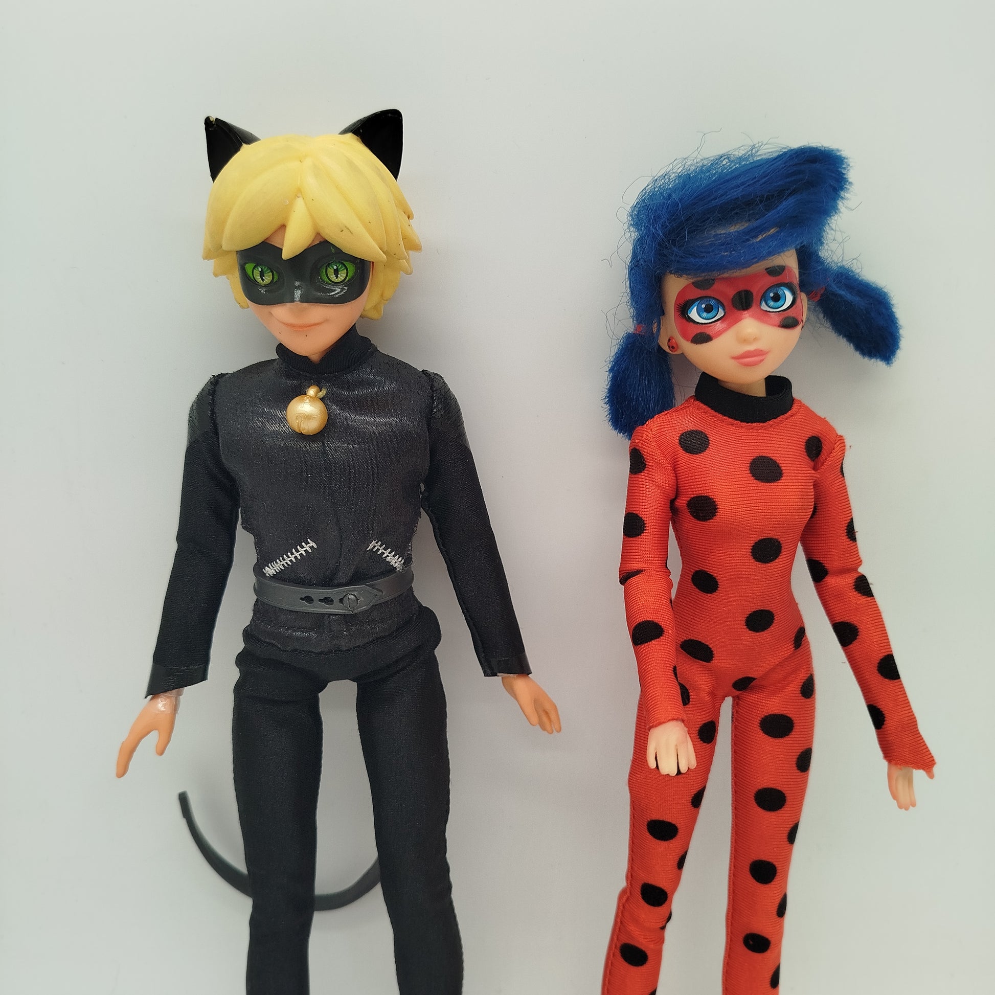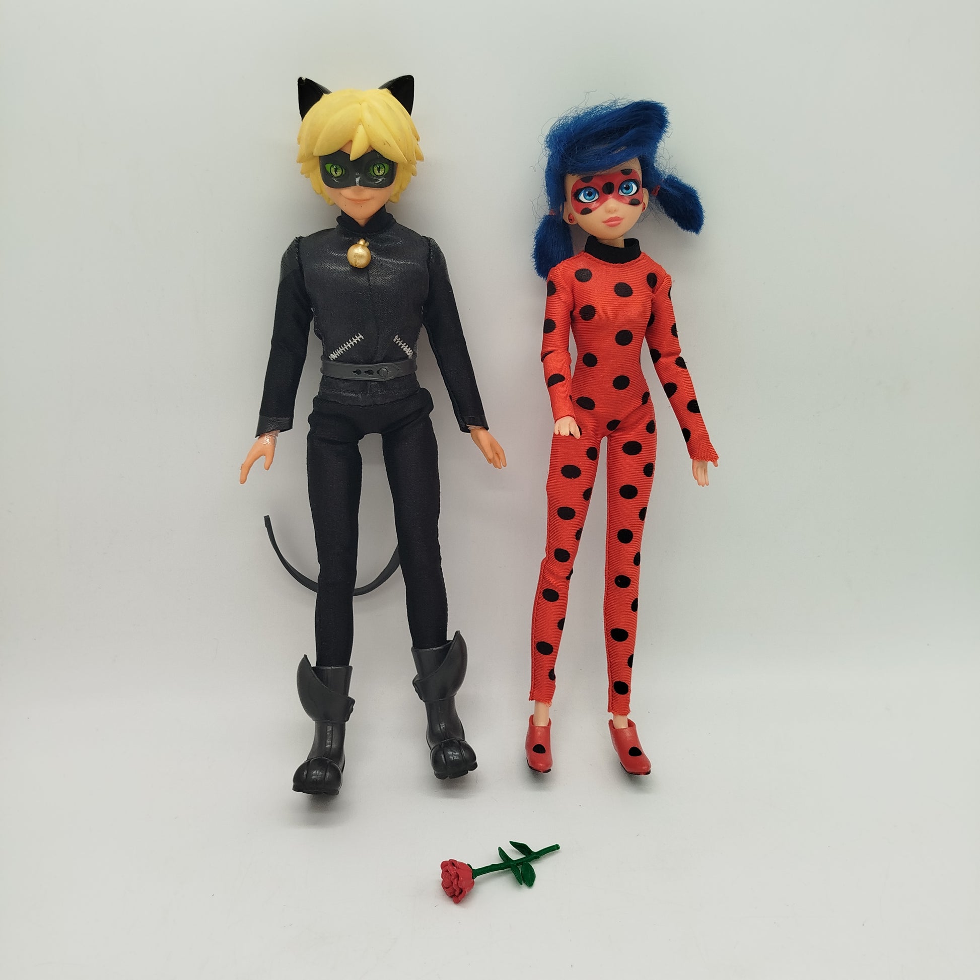 Hol dir das Miraculous Puppen-Set mit Ladybug und Cat Noir und erlebe spannende Abenteuer! Die beiden Puppen tragen ihre typischen Outfits – Ladybug im roten Anzug mit schwarzen Punkten, Cat Noir in schwarzer Kleidung mit goldfarbenem Halsaccessoire. Ein kleines Blumenaccessoire in Rot und Grün ist ebenfalls dabei. Verpackung fehlt, die Puppen zeigen sichtbare Gebrauchsspuren, sind aber spielbereit. Gib diesem Spielzeug ein neues Zuhause und erfreue dich an seinen kultigen Heldenfiguren.