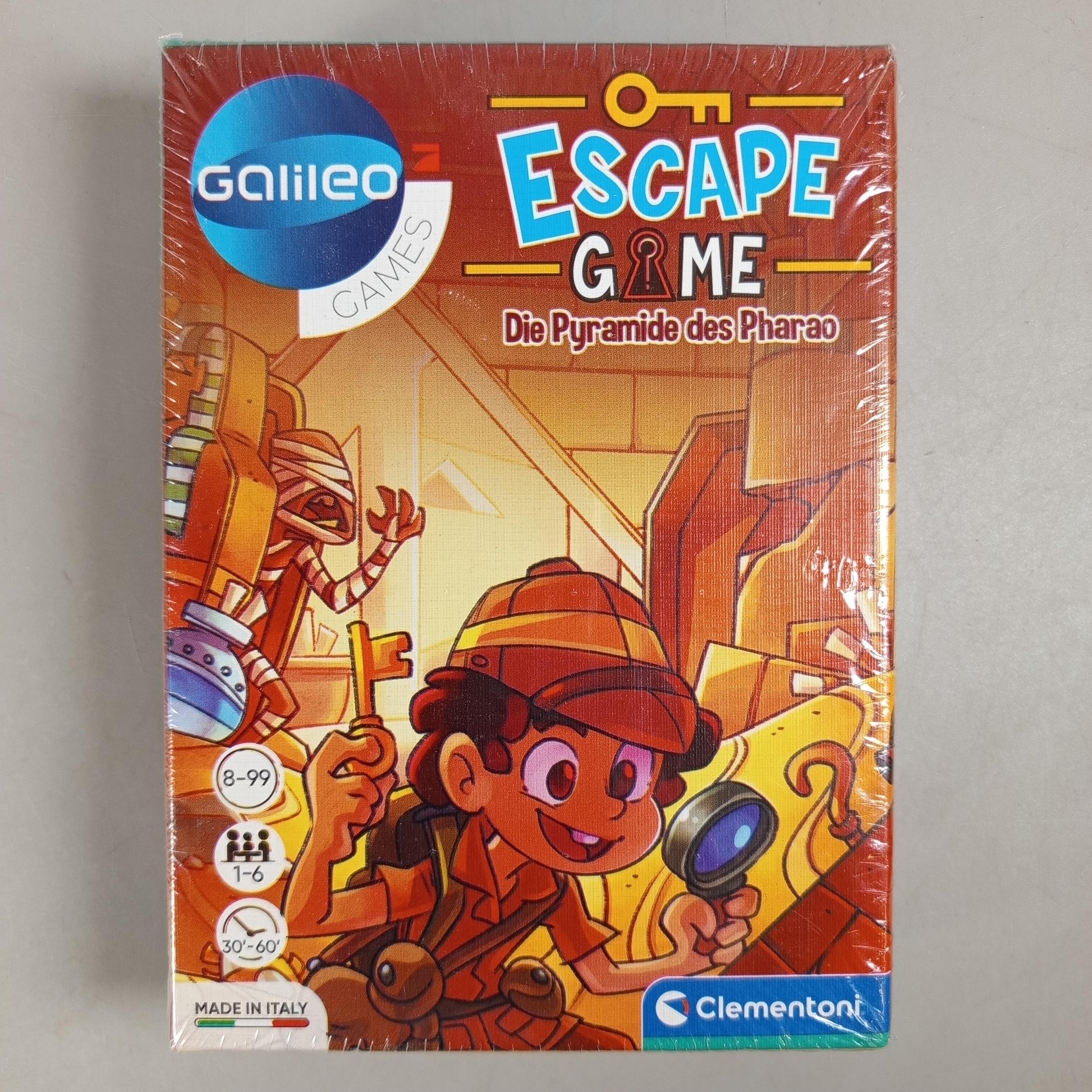 Hol dir das Galileo Escape Game Doppelset von Clementoni mit den spannenden Abenteuern 'Die Pyramide des Pharao' und 'Die verlassene Schule'. Beide Spiele bieten clever gestaltete Rätselräume, Karten und Objekte für 1–6 Spieler ab 8 Jahren. In deutscher Sprache, in Originalverpackung mit leichten Gebrauchsspuren. Die Vollständigkeit konnte nicht überprüft werden. Nachhaltig produziert in Italien mit FSC-zertifiziertem Material. Achtung: Nicht für Kinder unter 3 Jahren geeignet – Erstickungsgefahr durch Kleinteile.