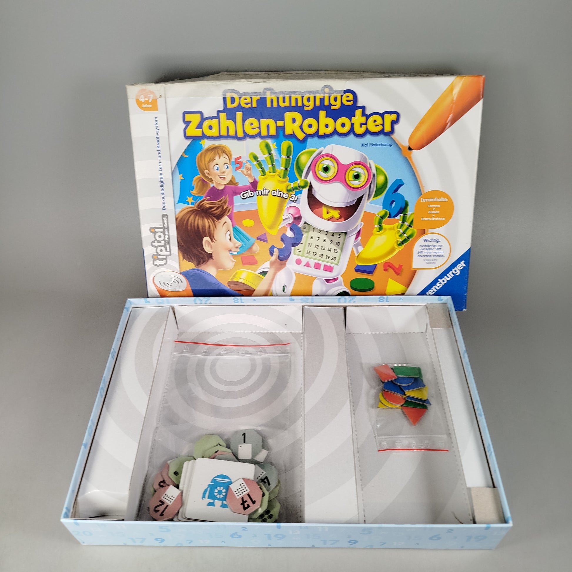 Hol dir das Lernspiel „Der hungrige Zahlen-Roboter“, bei dem Kinder Aufgaben lösen und den Roboter mit passenden Teilen füttern, wobei ein mehrteiliges Roboter‑Element aus Karton mit Zahlenfeld von 0 bis 20, nummerierte runde Chips, bunte geometrische Formen und illustrierte Karten enthalten sind. Der genaue Umfang der Teile ist visuell nicht eindeutig zählbar, daher ist die Vollständigkeit nicht abschließend beurteilbar. Der Zustand wirkt gebraucht, ohne klar erkennbare Beschädigungen, und das Spiel kommt in der originalen Verpackung. Für die Nutzung wird ein tiptoi‑Stift benötigt, der laut Verpackung nicht enthalten ist. Das Spiel ist für 1–4 Spieler ausgelegt, mit einer Spieldauer von etwa 15–20 Minuten, fördert Formen erkennen, Zählen und erstes Rechnen und eignet sich ideal, um einem Spiel aus zweiter Hand ein nachhaltiges zweites Leben zu schenken. Aufgrund enthaltener Kleinteile besteht Erstickungsgefahr, empfohlen für Kinder ab etwa 4 Jahren.
