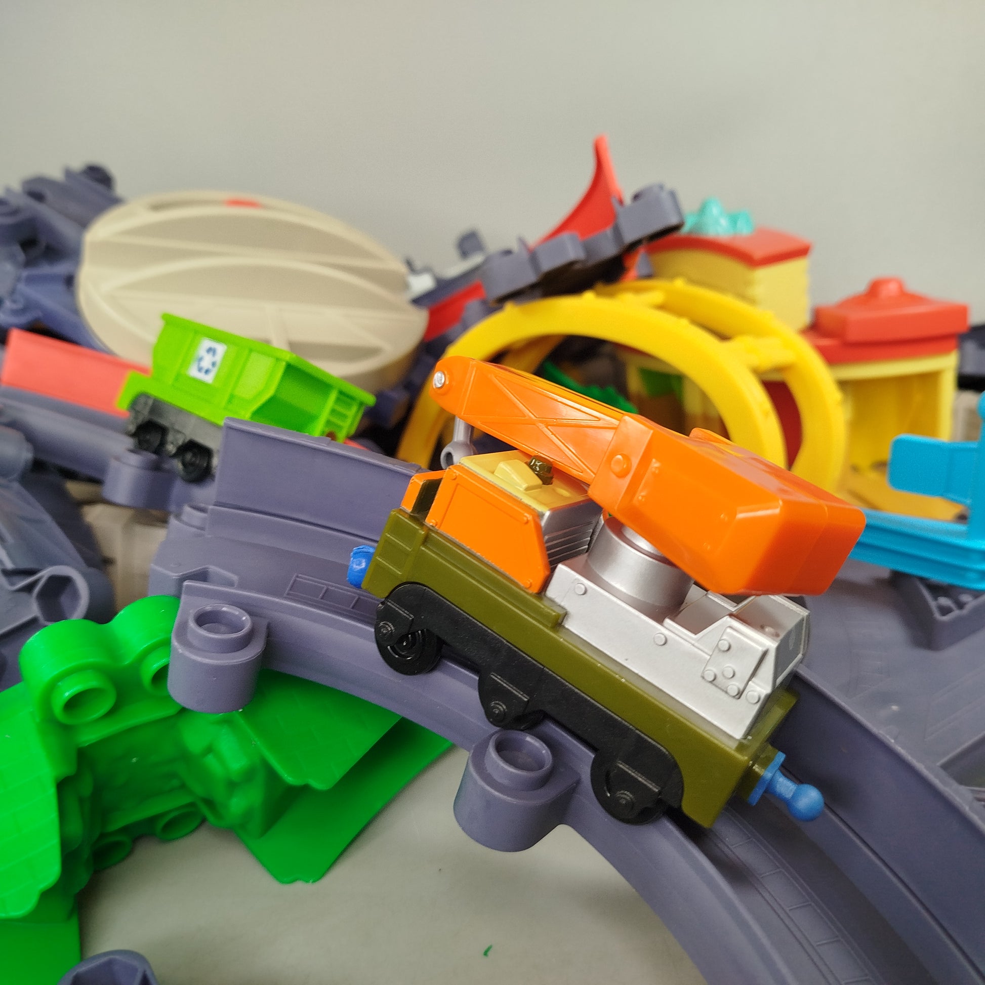Hol dir das Chuggington Eisenbahn-Schienen-Set und bring Bewegung ins Kinderzimmer! Das Spielzeug ist eine Eisenbahnstrecke aus Kunststoff mit vielen Schienenelementen, Stützen, einer Station, einer großen Drehscheibe und zwei Waggons, darunter ein Kranwagen und ein Recyclingwagen. Ideal für freies Bauen, Rollenspiele und das Nachspielen von Zugabenteuern. Gib dem Spielzeug ein zweites Leben und schone Ressourcen. Empfohlen für Kinder ab 3 Jahren. Hinweis gemäß GPSR: Enthält Kleinteile, nicht geeignet für Kinder unter 3 Jahren, Erstickungsgefahr.