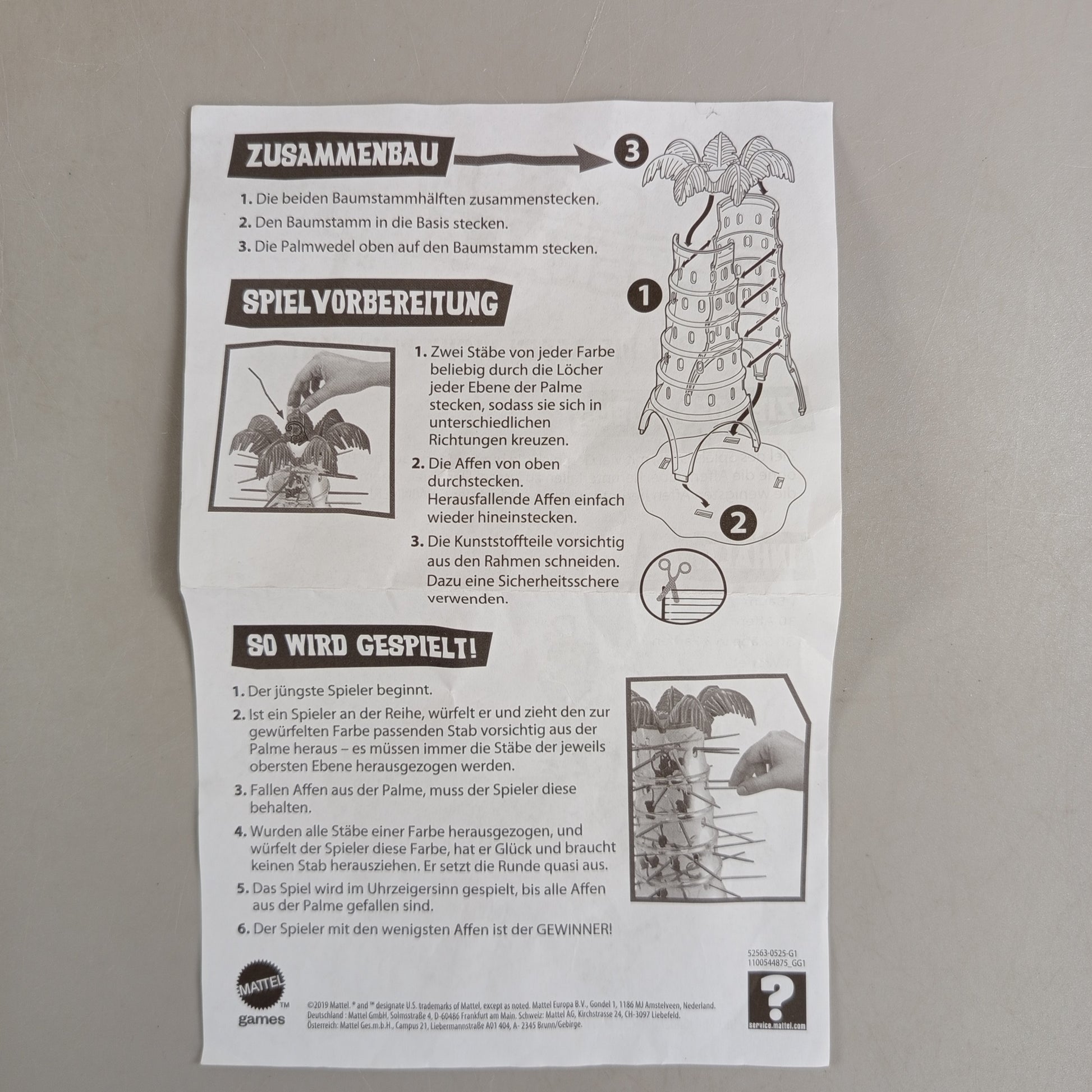 Hol dir das Geschicklichkeits-Brettspiel S.O.S. Affenalarm, bei dem ihr versucht, die Affen im Baum zu halten und sie nicht purzeln zu lassen. Enthalten sind der mehrteilige gelbe Kunststoff-Palmenbaum mit grünem Aufsatz, 30 braune Affenfiguren aus Kunststoff, zahlreiche Kunststoffstäbchen in Orange, Pink und Grün sowie ein Würfel mit farbigen Punkten, dazu kommen die originale deutschsprachige Spielanleitung und die Originalverpackung. Das Spiel ist gebraucht, sichtbare Abnutzung oder Defekte sind nicht ausdrücklich erkennbar. Die Vollständigkeit ergibt sich aus den sichtbaren Spielteilen, eine weitergehende Prüfung darüber hinaus ist nicht möglich. Die Originalverpackung ist vorhanden. Als Second-Hand-Spiel erhält dieses klassische Familienspiel ein zweites Leben und schont Ressourcen. Das Spiel ist für 2–4 Spieler ab 5 Jahren geeignet und enthält Kleinteile, die für Kinder unter 3 Jahren nicht geeignet sind.