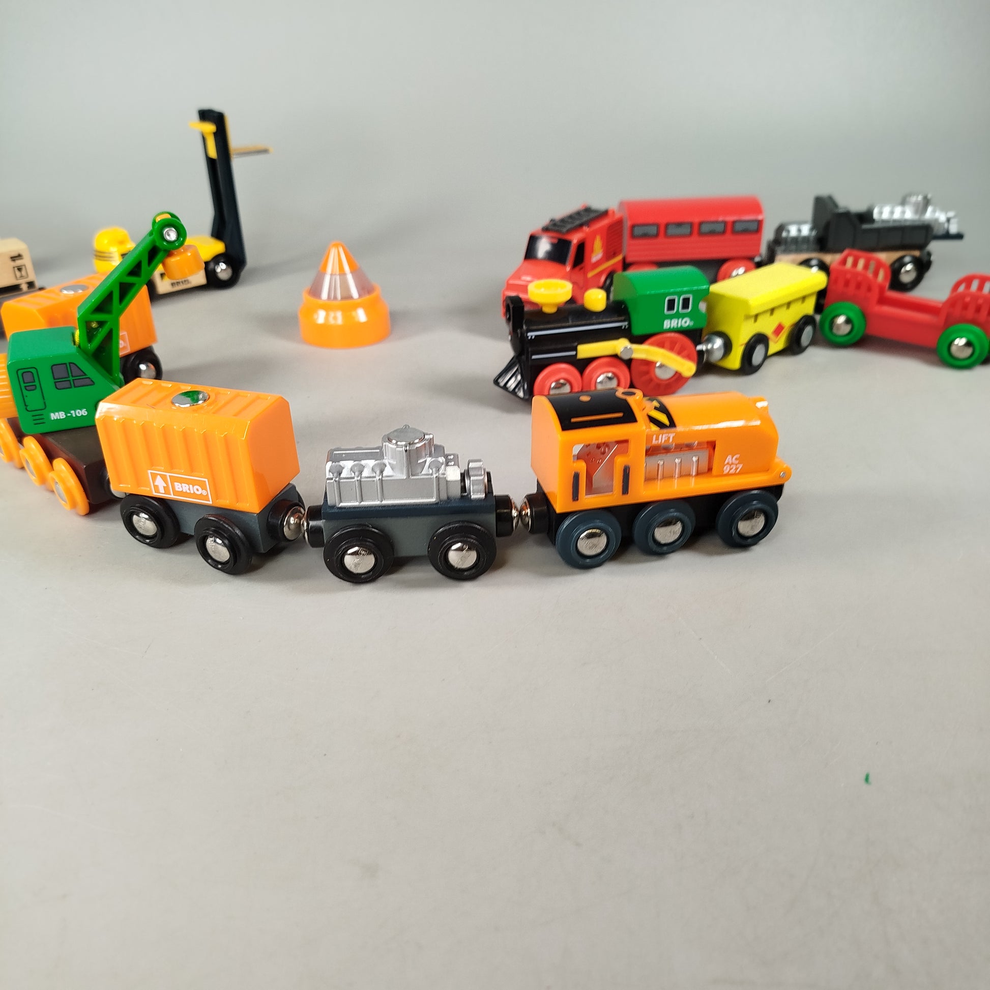 Hol dir das BRIO Holzeisenbahn-Set mit fünf Zügen und Fahrzeugen aus Holz und Kunststoff. Enthält orangefarbene Güterwagen, einen weißen Personenzug in drei Teilen, eine grüne Kranlok und weitere Waggons. Ideal für kreative Spielwelten und Rollenspiele mit Schienen. Das Set befindet sich in einem sehr guten gebrauchten Zustand, leichte Gebrauchsspuren sind sichtbar. Die Vollständigkeit konnte nicht überprüft werden. Gib diesem Spielzeug ein neues Zuhause und fördere nachhaltiges Spielen. Hinweis: Nicht für Kinder unter 3 Jahren geeignet, da Kleinteile verschluckt werden können.