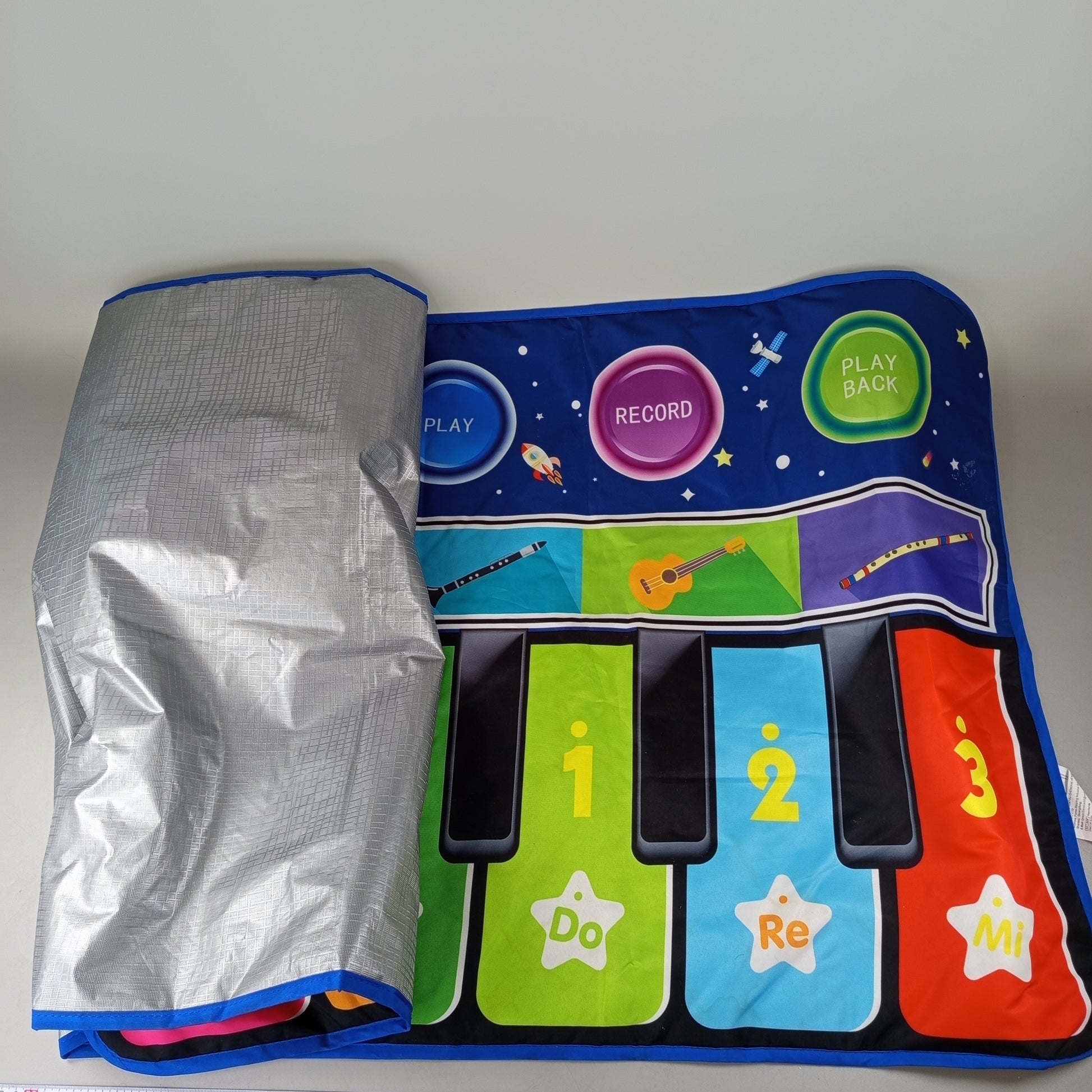 Die Musical Mat – Elektronische Klaviermatte ist ein elektronisches Musikinstrument für Kinder. Sie verfügt über eine farbenfrohe Klaviermatte mit markierten Tasten sowie Bedienelementen wie ON/OFF, DEMO, ONE KEY ONE NOTE, PLAY, RECORD und PLAY BACK. Die Oberfläche zeigt Abbildungen von Astronaut, Sternen, Raketen und verschiedenen Musikinstrumenten. Batterien sind nicht enthalten. Altersempfehlung: 3–5 Jahre. Achtung: Nicht für Kinder unter 3 Jahren geeignet.