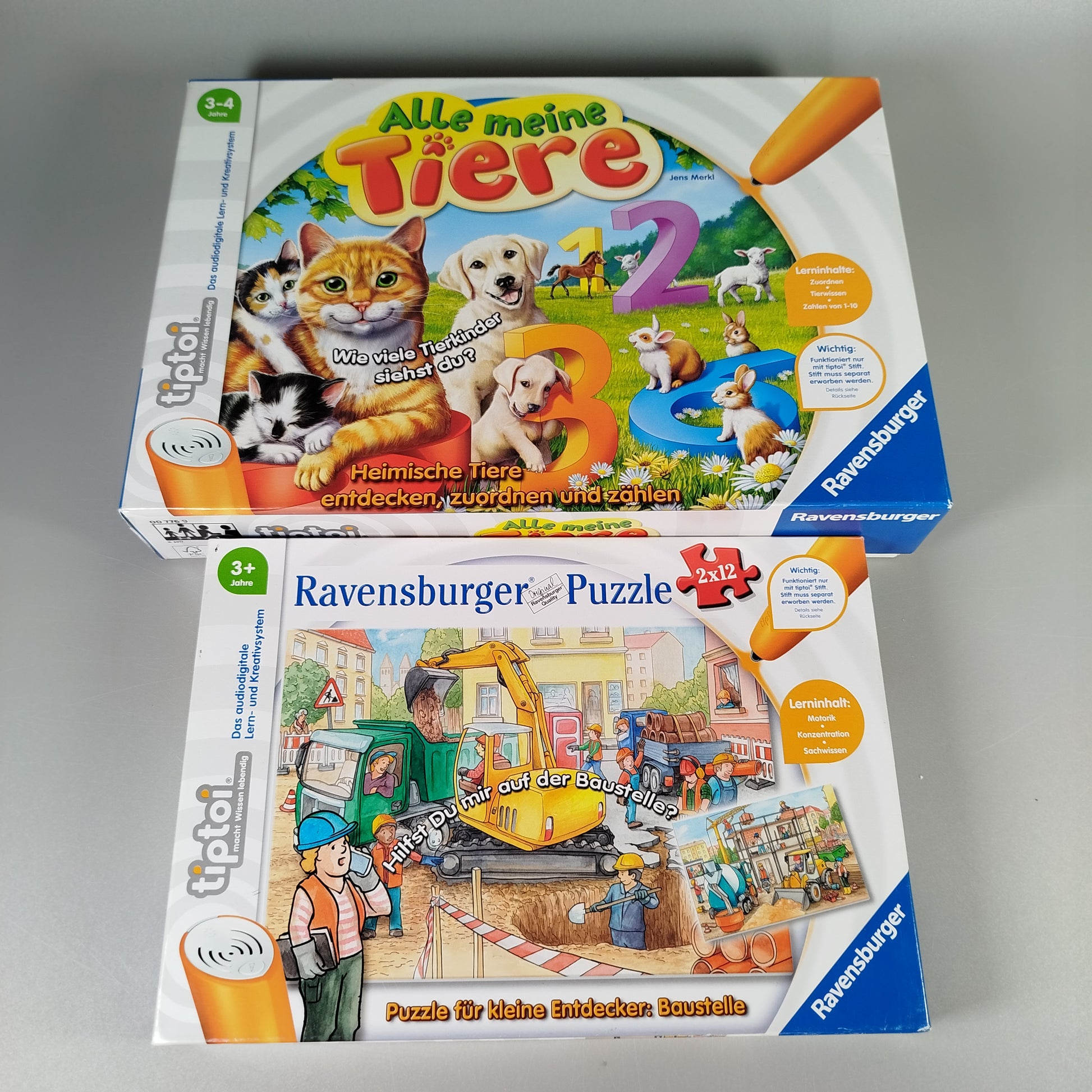 Hol dir das Ravensburger tiptoi Spieleset und entdecke die Welt der Tiere und Baustellen! Dieses Set enthält das "Alle meine Tiere" Buch, das es Kindern ermöglicht, ihre Lieblingshaustiere zu erkennen und mit ihnen zu zählen, sowie zwei 12-teilige Puzzles mit Baustellenmotiven. Ideal für interaktive und lehrreiche Spielsitzungen mit dem Tiptoi-Stift (separat erhältlich). Gib diesen Lernspielzeugen ein neues Zuhause und fördere spielerisch die Entwicklung deines Kindes! Hinweis: Enthält Kleinteile, nicht geeignet für Kinder unter 3 Jahren. Erstickungsgefahr! Beide Produkte sind in gutem gebrauchten Zustand ohne Originalverpackung.