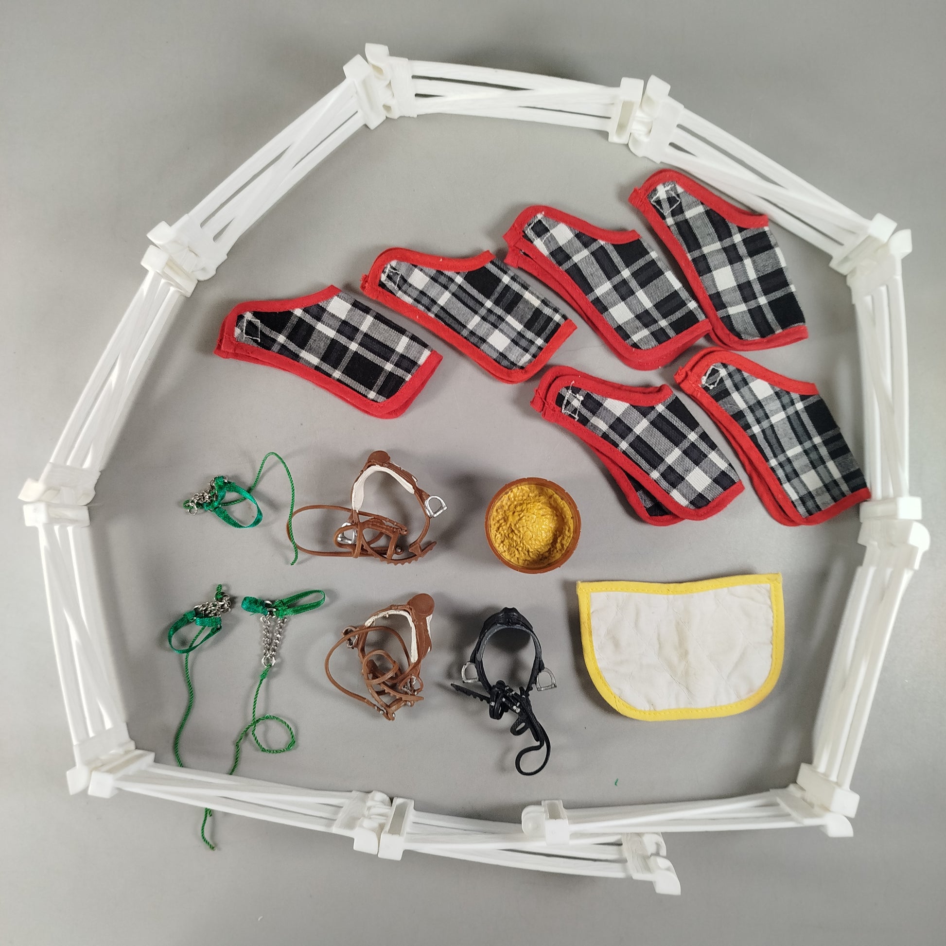 Hol dir das Schleich Figuren-Set für spannende Reitabenteuer! Enthalten sind 8 reitende und stehende Menschenfiguren, eine Katze, Zaunelemente sowie verschiedene Zubehörteile aus Stoff und Kunststoff für Pferde. Das Spielzeug befindet sich in einem hervorragenden gebrauchten Zustand. Ideal für kreatives Spielen und Sammeln!