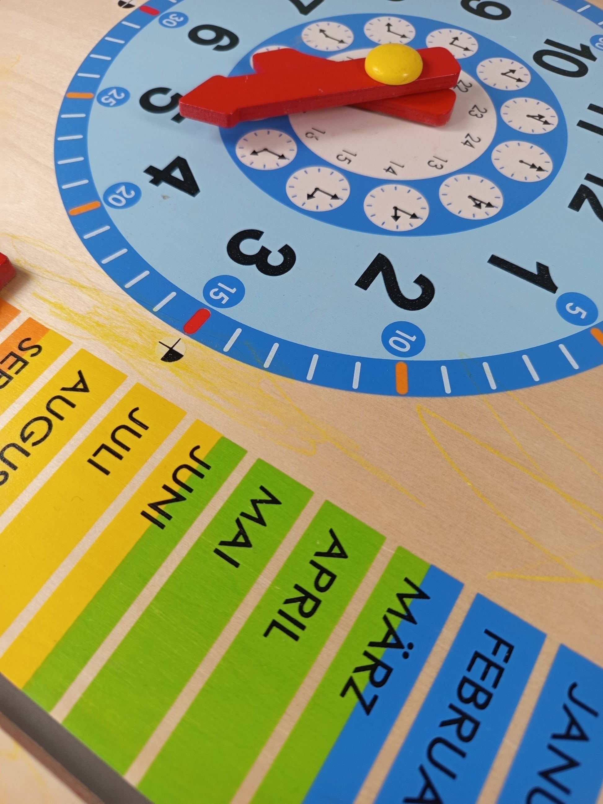 Hol dir diese liebevoll gestaltete Kalenderuhr aus Holz und unterstütze dein Kind spielerisch beim Lernen von Uhrzeit, Datum, Monaten, Jahreszeiten und Wetter! Die stabile Lernuhr von Goula (Jumbo Disset, S.A.) kombiniert eine analoge Uhr mit beweglichen roten Zeigern, einen Kalender mit den Tagen von 1–31, Wochentagen und Monaten auf Deutsch sowie Anzeigen für Jahreszeiten und Wetter, die über vier rote Schieberegler und einen gelben Drehknopf eingestellt werden können. Enthalten ist eine einzelne Lernuhr-Tafel ohne weiteres Zubehör.Hinweis zur Sicherheit: Enthält bewegliche Kleinteile, daher nicht für Kinder unter 3 Jahren geeignet. Erstickungsgefahr!
