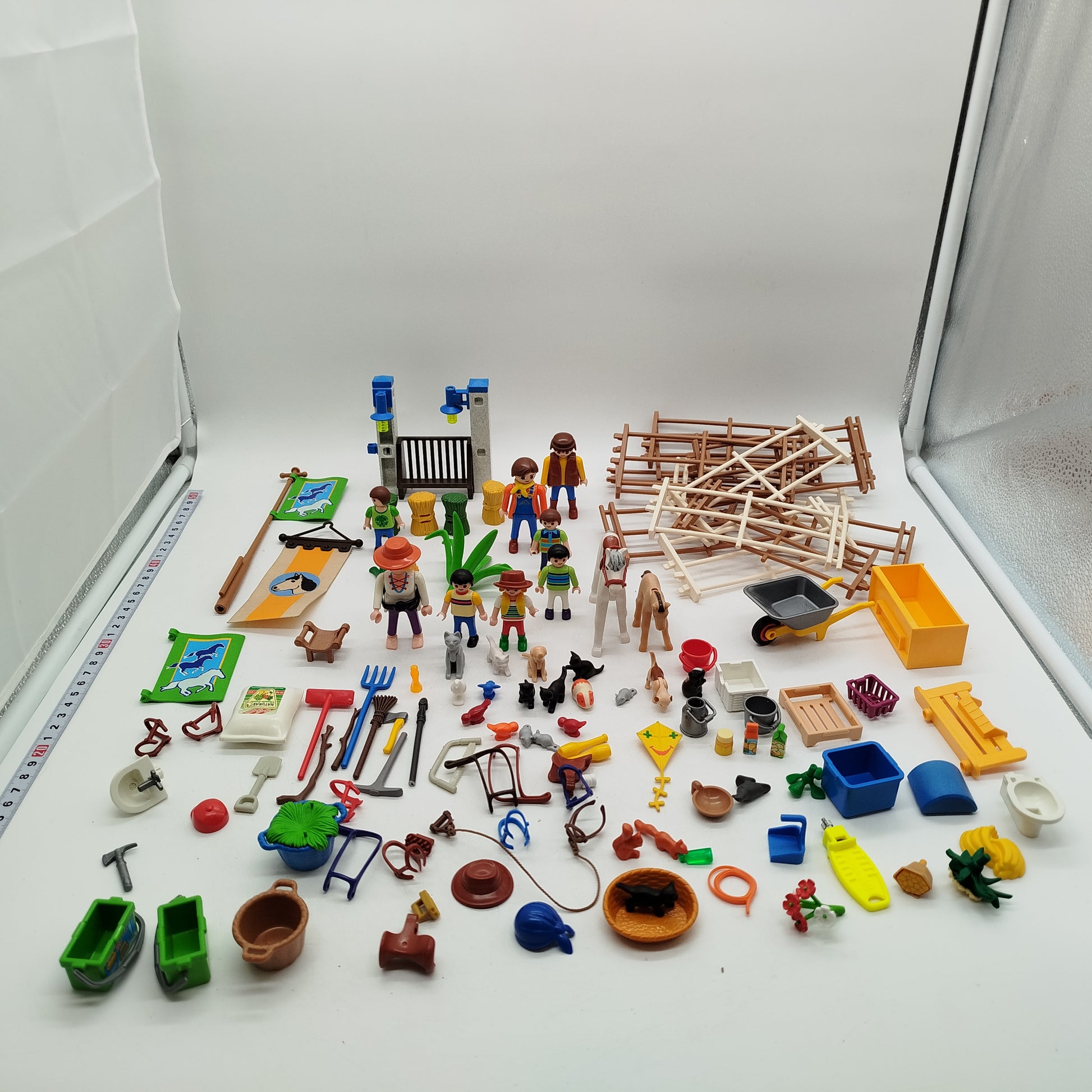 Hol dir das Playmobil Reiterhof-Set mit über 35 Figuren und Tieren für endlose Bauernhof-Abenteuer! Enthalten sind 22 menschliche Figuren, mehr als 15 Tiere wie Pferde, Hunde, Katzen und Vögel sowie zahlreiches Zubehör wie Sättel, Zäune, Fahrzeuge, Anhänger und Werkzeuge. Ideal für kreatives Rollenspiel rund ums Leben auf dem Hof. Die Figuren befinden sich in sehr gutem gebrauchten Zustand, Verpackung fehlt. Gib diesem Spielzeug ein neues Zuhause und fördere fantasievolles Spielen! Hinweis: Nicht für Kinder unter 3 Jahren geeignet, da Kleinteile verschluckt werden können.