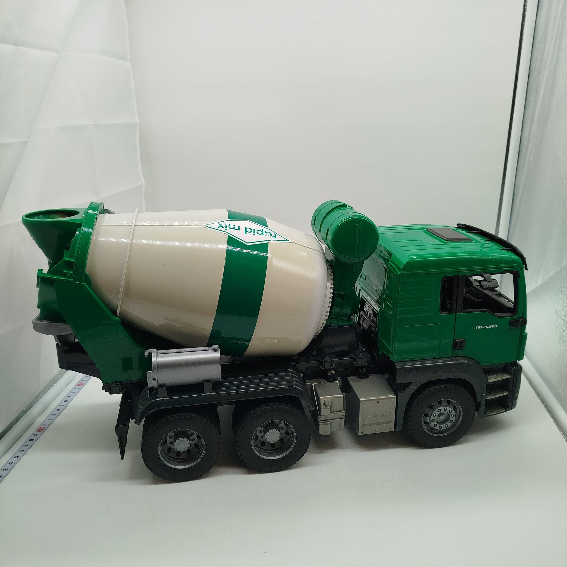 Hol dir das Bruder TGS Betonmisch-LKW rapid mix und bring echtes Baustellen-Feeling ins Kinderzimmer! Das detailreiche Spielfahrzeug zeigt einen Betonmischer auf TGS-Basis mit markanter grün-weißer Farbgebung und beweglichen Funktionen wie öffnenden Kabinentüren. Der Mischer ist für fantasievolle Rollenspiele rund um Bau und Transport gedacht und kommt ohne Figuren oder weiteres Zubehör. Gib diesem robusten Spielzeug ein neues Zuhause und schenk ihm ein zweites Leben. Geeignet für Kinder ab 3 Jahren gemäß europäischer GPSR-Richtlinien.