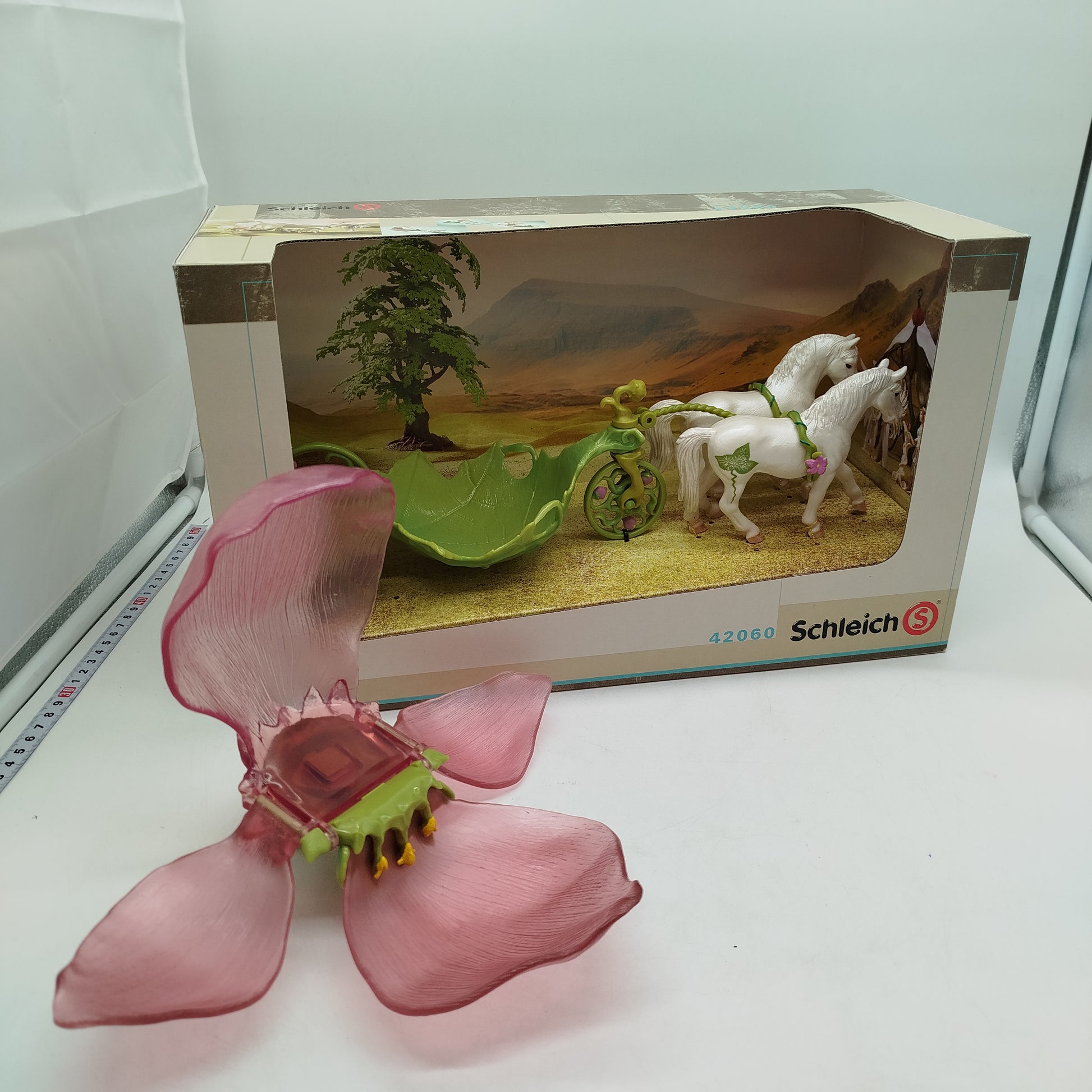 Hol dir das zauberhafte Schleich BAYALA Elfenkutschen-Spielset und tauche ein in eine fantasievolle Märchenwelt voller Magie! Dieses detailreiche Fantasy-Spielzeug besteht aus einer festlichen grünen Kutsche mit Blattmotiv und einem abnehmbaren, pinkfarbenen, durchscheinenden Blütendach sowie zwei weißen Pferdefiguren mit grünen Geschirren – perfekt für kreative Rollenspiele ohne humanoide Figuren. Das Spielzeug kommt in der originalen Verpackung und eignet sich wunderbar, um fantasievolle Geschichten zu erfinden und der Spielwelt ein neues Zuhause zu schenken, statt Neues zu kaufen. Enthalten sind genau eine Elfenkutsche und zwei Pferdefiguren, weitere Figuren sind nicht dabei. Die Maße der Kutsche sind nicht angegeben. Das Spielzeug befindet sich in einem guten gebrauchten Zustand. Die Originalverpackung ist vorhanden. Die Vollständigkeit des Sets ist anhand der sichtbaren Inhalte gegeben. Ideal für Kinder, die gerne in magische Welten eintauchen. Hinweis gemäß GPSR: Enthält Kleinteile, nicht geeignet für Kinder unter 3 Jahren, Erstickungsgefahr!