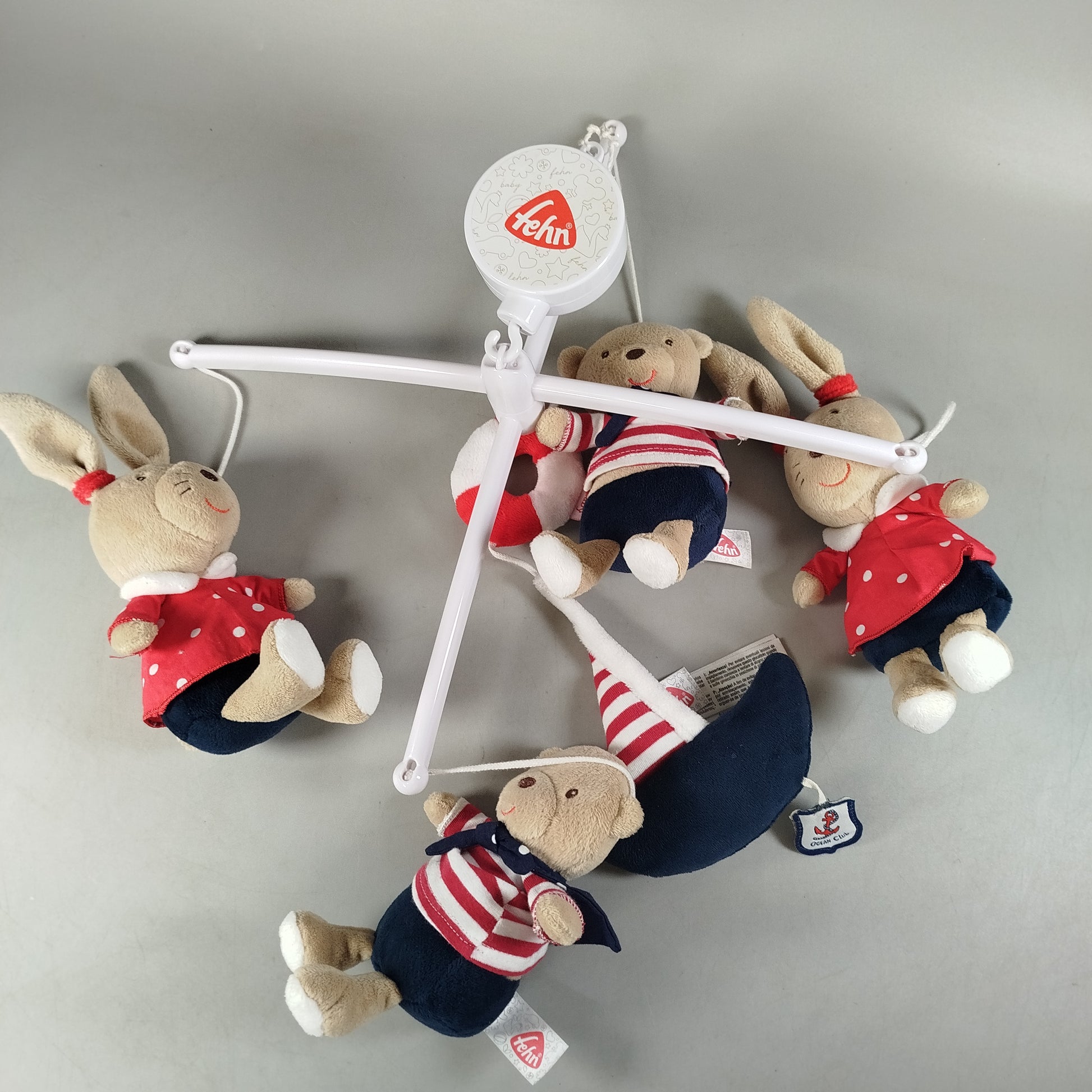 Hol dir das Musik-Mobile Ocean Club von Fehn und bring sanfte Bewegung und Melodien ans Babybett. Das Baby-Mobile mit Spieluhr hängt über dem Bettchen und zeigt maritime Plüschfiguren in Rot, Weiß und Blau, die sich zur Musik drehen. So wird Beobachten und Lauschen zum ruhigen Einschlafritual. Gib diesem Spielzeug ein neues Zuhause und schenke ihm ein zweites Leben. Geeignet für Babys im ersten Lebensjahr.