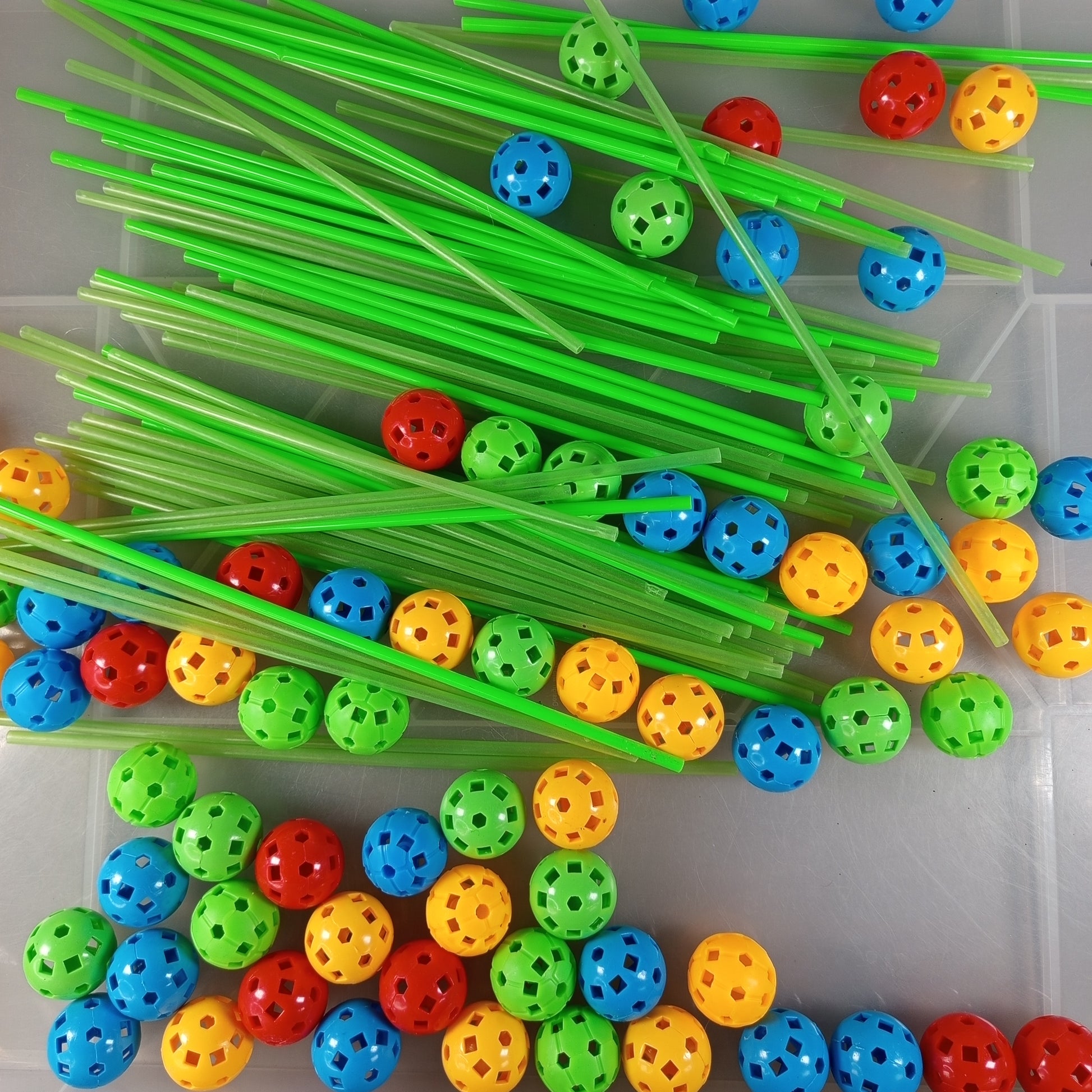 Hol dir das farbenfrohe Baukonstruktions-Set mit 87 Kunststoffstäben und 70 perforierten Kugeln und erlebe kreativen Bauspaß! Die Teile lassen sich leicht verbinden und fördern Fantasie sowie räumliches Denken. Das Spielzeug zeigt leichte Gebrauchsspuren und ist insgesamt in gutem Zustand. Die Vollständigkeit konnte nicht überprüft werden. Ideal für Kinder zum freien Bauen und Konstruieren. Hinweis: Enthält Kleinteile, nicht geeignet für Kinder unter 3 Jahren.