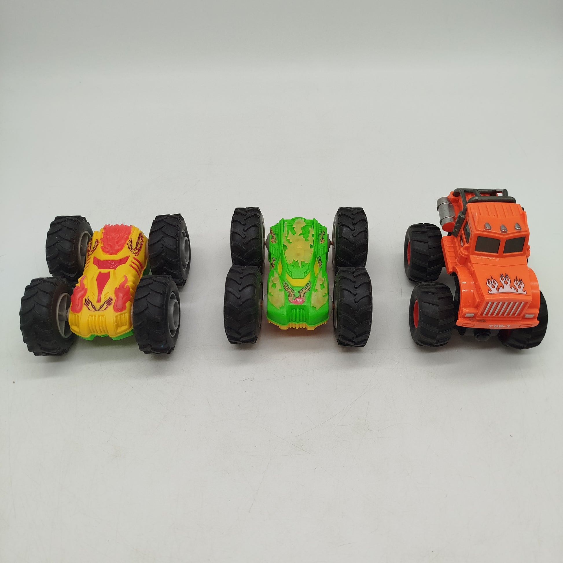 Hol dir das Monstertruck-Set mit drei robusten Fahrzeugen, die für spannende Rennen im Kinderzimmer sorgen. Die Trucks sind farbenfroh gestaltet, darunter ein orangefarbener Truck mit weißen Flammen und dem Schriftzug TOP. Ideal für kleine Autofans und Sammler. Das Spielzeug befindet sich in einem sehr guten gebrauchten Zustand. Gib diesen Trucks ein neues Zuhause und sorge für langanhaltenden Spielspaß!